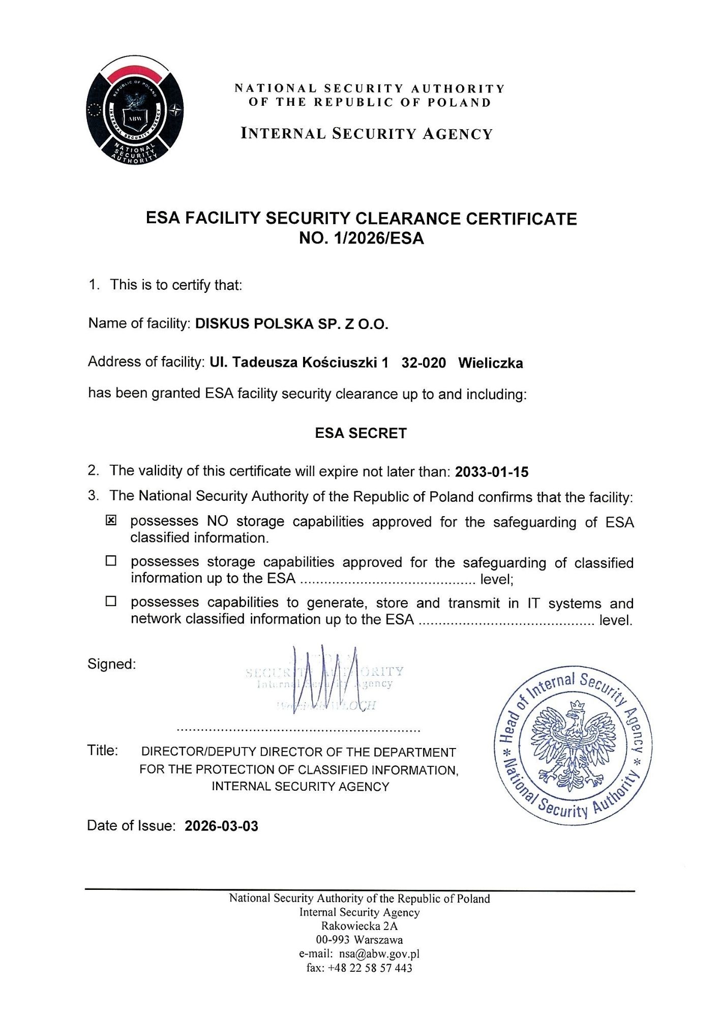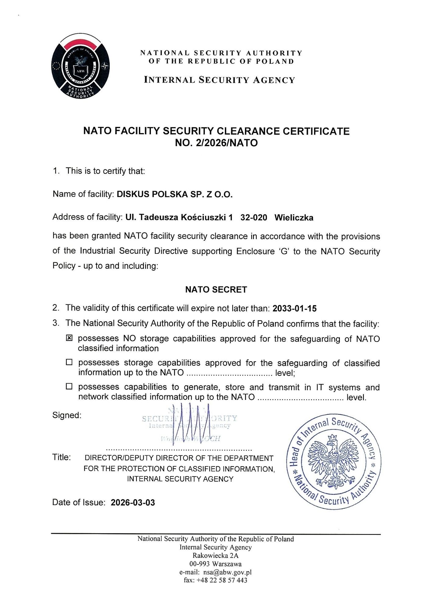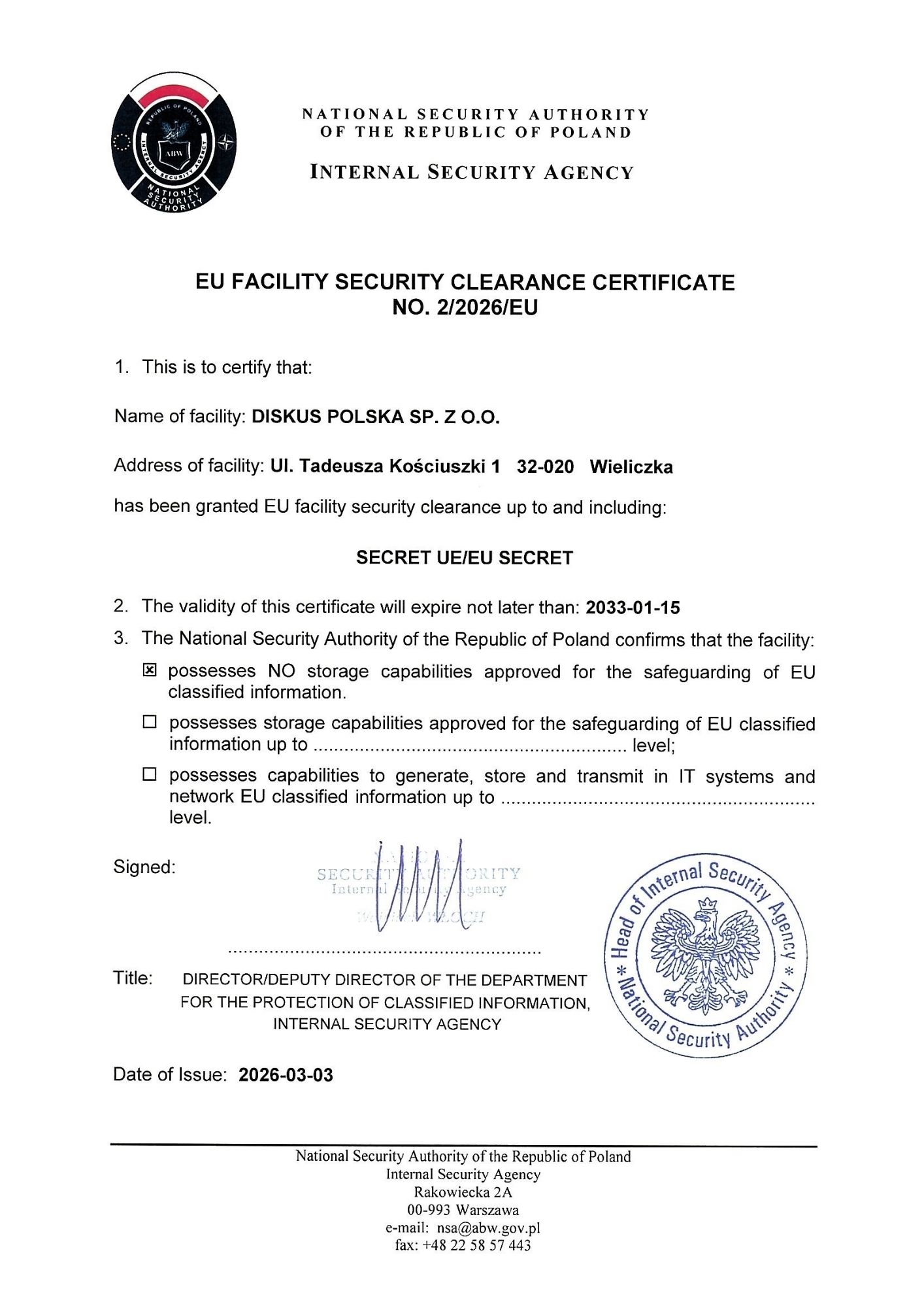 We are pleased to announce that DISKUS Polska, the manufacturer of ProDevice solutions, has been granted a Facility Security Clearance Certificate issued by the National Security Authority of the Republic of Poland up to and icluding:
