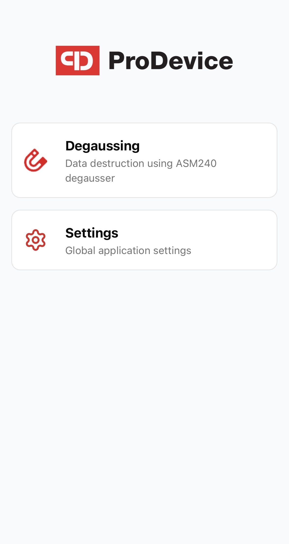 The ProDevice HUB multi-platform application is a modern tool designed to work with the ProDevice ASM240 degausser in the PROFESSIONAL or ULTIMATE version (manufactured after the third quarter of 2025 with serial numbers starting with “ASM240”). It enables full integration with the device, streamlining the documentation of the data media degaussing process. By automating key stages, users gain quick access to process information and the ability to create detailed reports. An intuitive interface and advanced features, such as serial number scanning, image capture, video recording of the degaussed media, enhance convenience and workflow efficiency. The application was designed with security, transparency, and professional management of the degaussing process in mind.